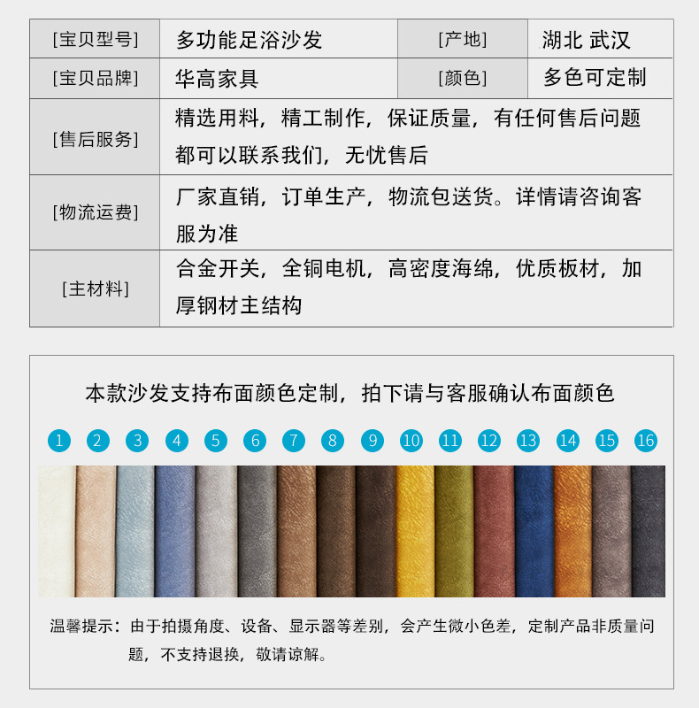 5、足浴沙发面料:面料颜色有多种类,客户可以任意选择!